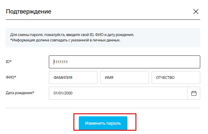 Введите свой ID, ФИО и дату рождения и нажмите «Изменить пароль».