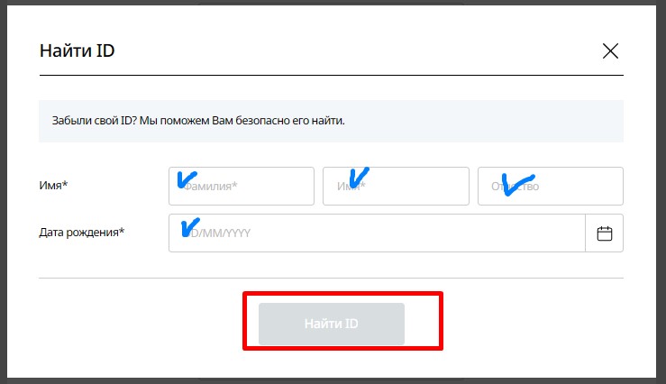 Введите свой ID, ФИО и дату рождения и нажмите «Изменить пароль».